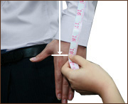 请您伸直手臂两臂下垂,用皮尺从肩膀处到手心的距离即为您的臂尺寸。