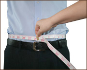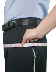 请您双脚并拢站直,两臂自然下垂,不要收腹,呼吸保持平稳,按图片皮尺围绕的部位水平测量一周,让皮尺和您的身体之间有一个手指的位置,量出的尺寸就是您的腰围尺寸。