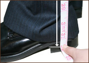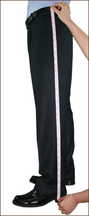 您双脚并拢站直,从腰部到您鞋跟的高度即为您的裤长。